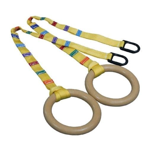 Useful for gymnastics programs, obstacle courses, fitness programs, and preschool play. Each set of Gymnastic Rings straps that fully adjustable in height. Don’t want the rings and are just interested in our adjustable straps? Consider the 9-foot straps only option, which are made similarly to the ones that come with the rings, but allow for suspension from higher heights (like competitive rings or high bar) and are reachable for ground work. These rings are not intended for gymnastics rings competition. However, using gymnastic rings like these can help with: grip strength from hanging, swinging, pull-ups, leg lifts, arm strength and ab strength.