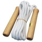 This traditional cotton jump rope has wooden handles and is 8′ long.