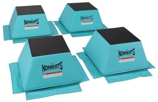 Posts have a 24″ x 24″ square base that tapers to an 18″ x 18″ top surface and are 14″ tall. Black non-slip vinyl on top with turquoise sides. All Ninja Obstacle Course obstacles securely attach to carpet bonded foam with strategically placed hook fastener flaps and strips. These posts have 4” strips of hook fastener permanently attached to the bottom plus 4 flaps with 4″ hook fastener. Covered with 18 oz. coated vinyl, stitched with Dacron thread and filled with polyurethane foam sandwiched between crosslink for optimal footing.