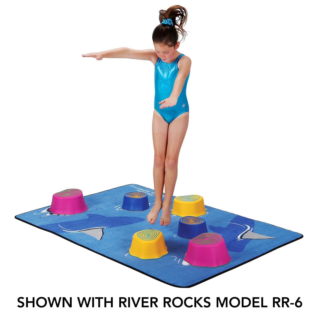 Our Ninja Shark Mat is an awesome challenge that young kids love. They have to jump from rock to rock without landing in the water with the sharks! They can jump from big rock to big rock, but if they can’t quite make it they can use the small rocks to get them to the end. This is great for learning jumping skills and balance through movement while using their imagination!