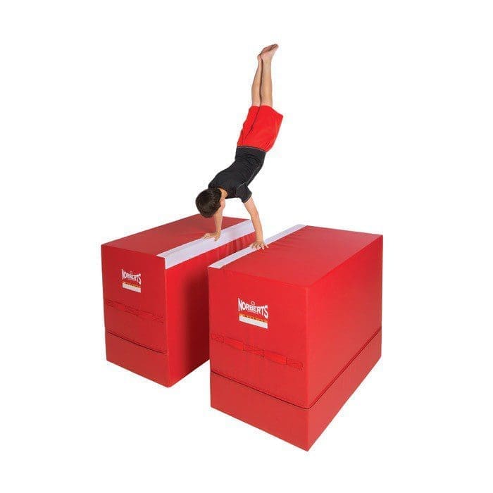 White stripes along two edges of each cover visually represent P-bar rails. Although developed as a men’s bar trainer, these 48″L X 28″W X 40″H blocks are useful for a variety of other purposes in both men’s & women’s programs.