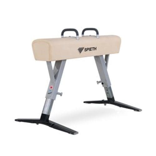 The Pommel Horse by SPIETH Germany has a 2-leg base with height adjustment from 95 (372/5”) to 125cm (49 1/5”) in 5cm (2”) increments.